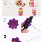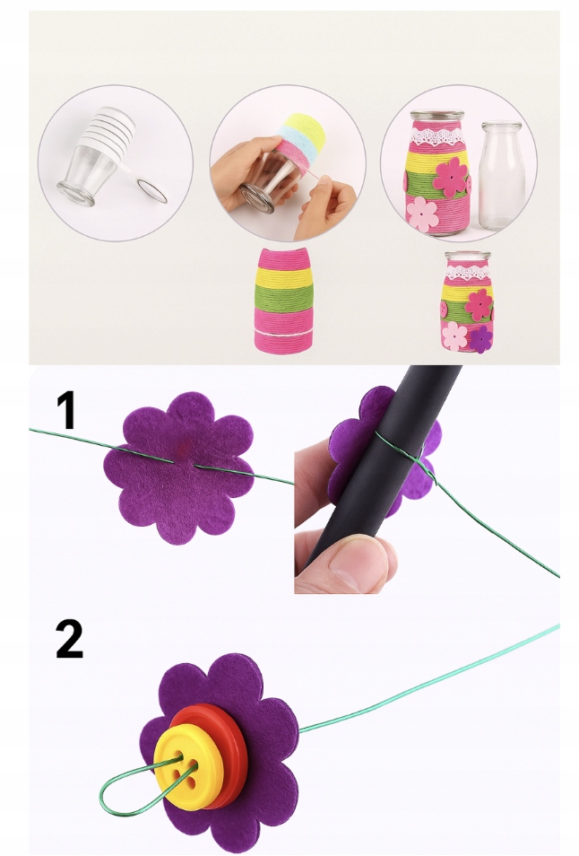 • przez druciki dołączone do zestawu przekładamy filcowe kwiatki i guziki, kolejność i ilość dowolna